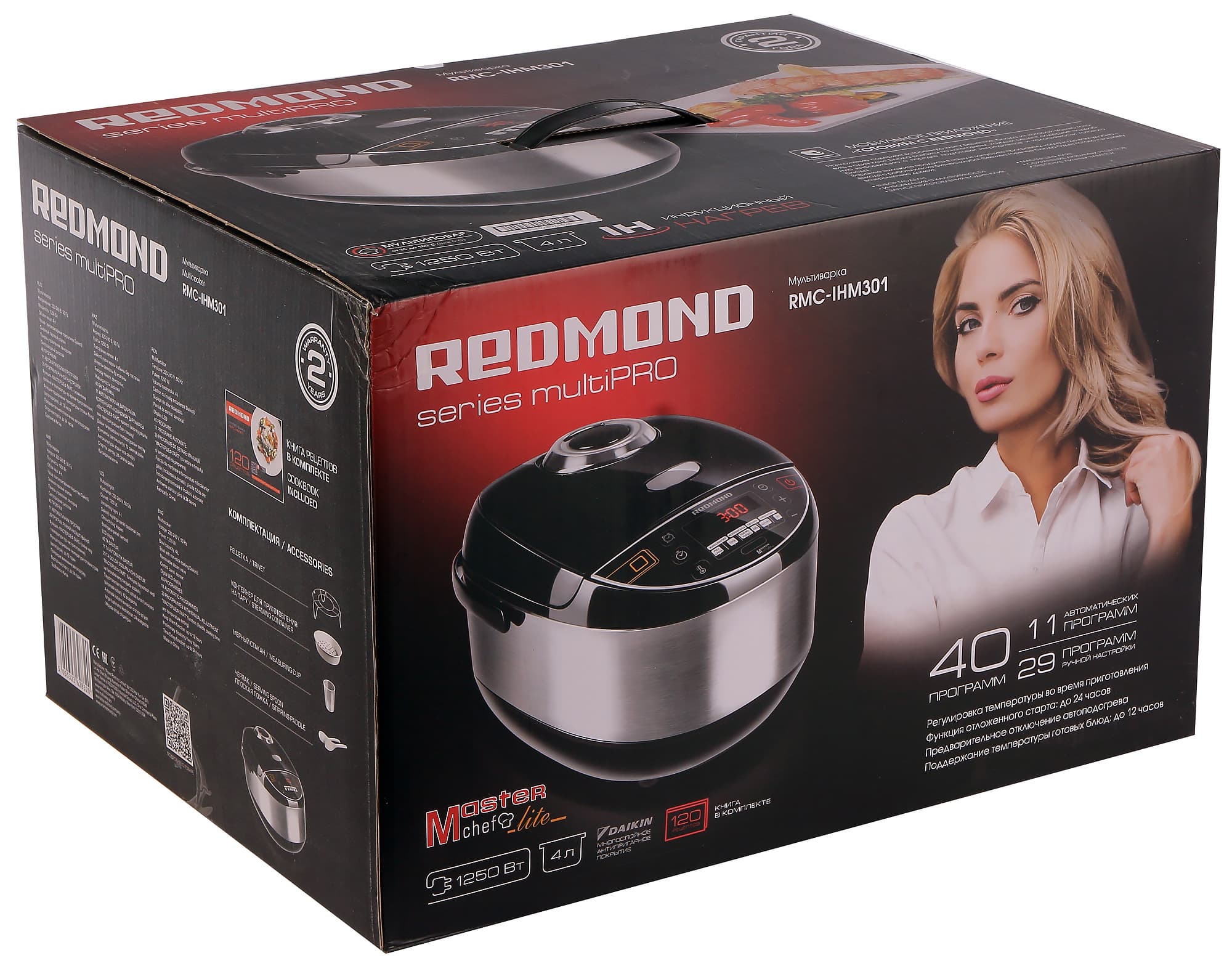 Те, кто уже встречал продукцию компании Redmond на полках магазинов, наверняка узнают характерный дизайн и фирменную стилистику: для оформления коробки использована стандартная «редмондовская» красно-черная цветовая гамма и стандартные же приемы — фотография симпатичной девушки, изображение мультиварки, фотографии готовых блюд… Найдется тут и всевозможная полезная информация, касающаяся технических характеристик прибора и его ключевых особенностей.
