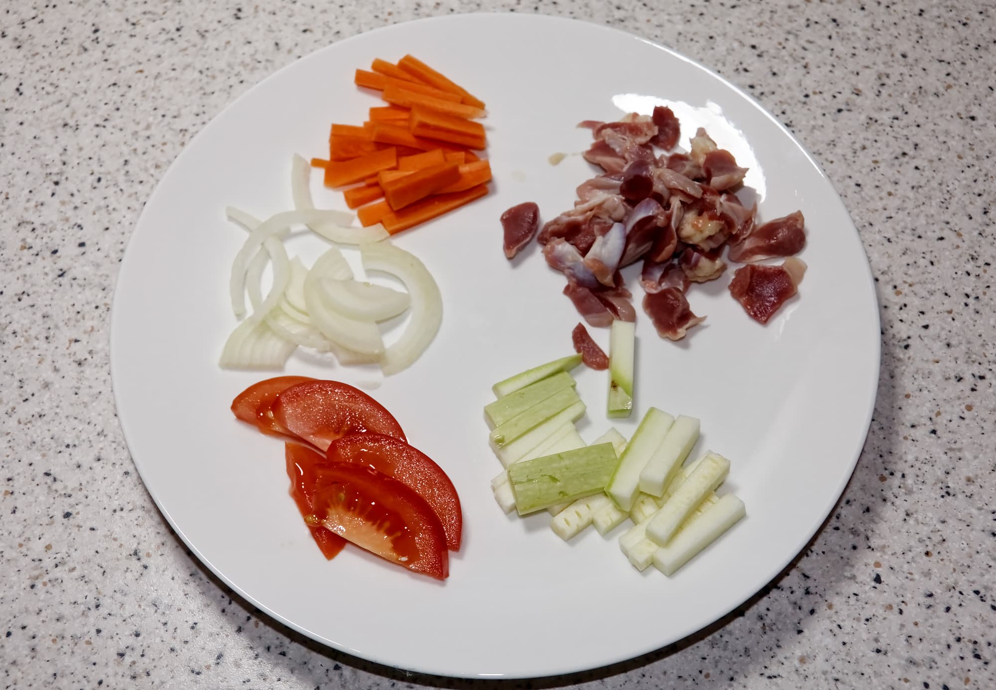 Для приготовления этого блюда нужно подготовить желудки (удалить пленки) и все остальные ингредиенты — очистить и нарезать средней соломкой. Все ингредиенты укладываются в чашу мультиварки, заливаются водой и готовятся с добавлением специй и соли на программе «Тушение» на протяжении 1 часа.