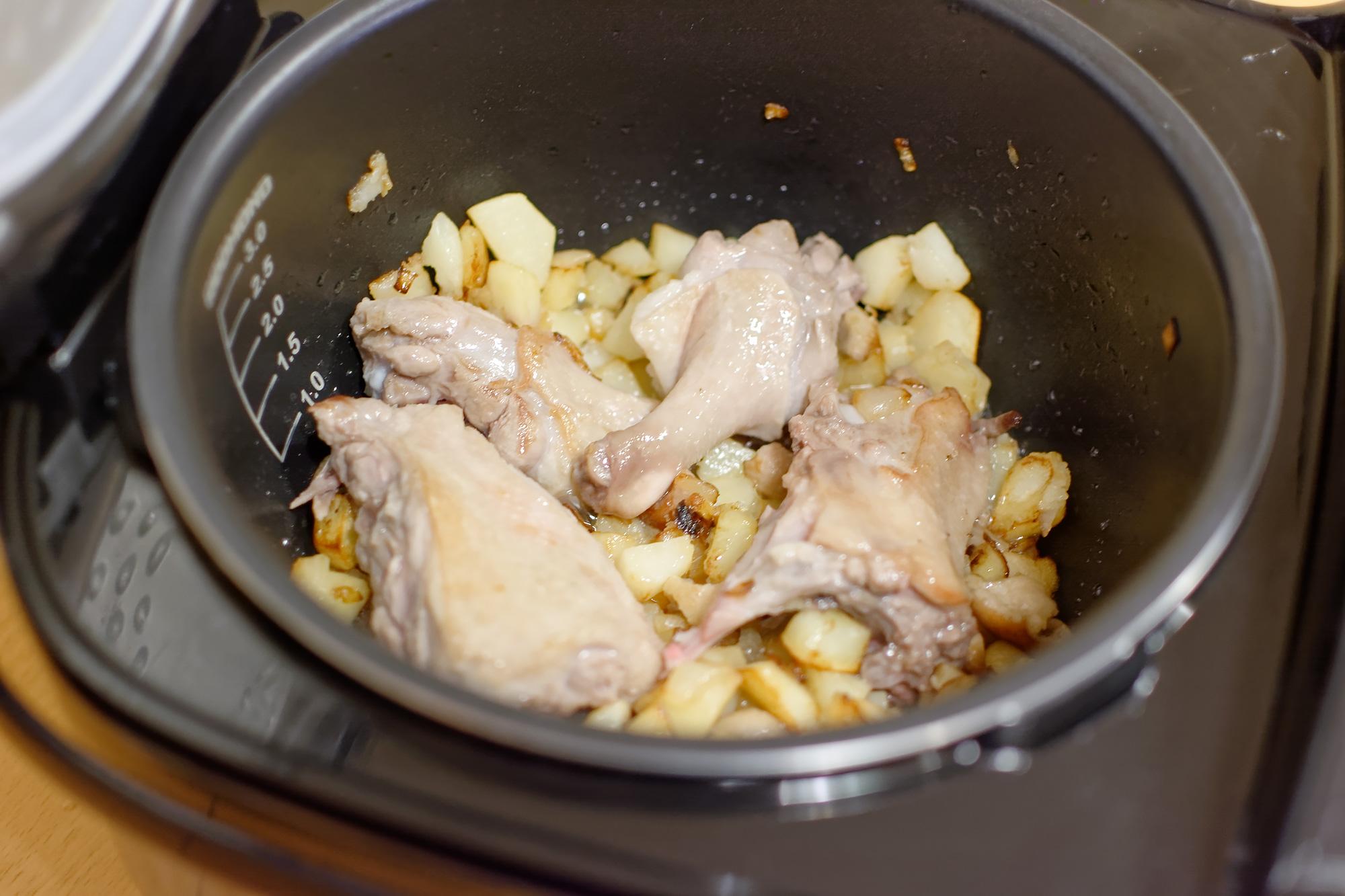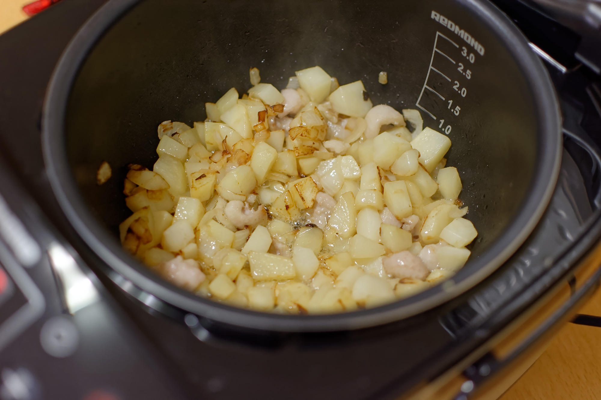 Первым делом мы обрезали с утки некоторое количество шкурки с жиром и стали обжаривать эти кусочки, вытапливая жир в режиме жарки. Затем на этом жиру обжарили лук, затем нарезали кубиками картошку и продолжили обжарку вместе с луком.