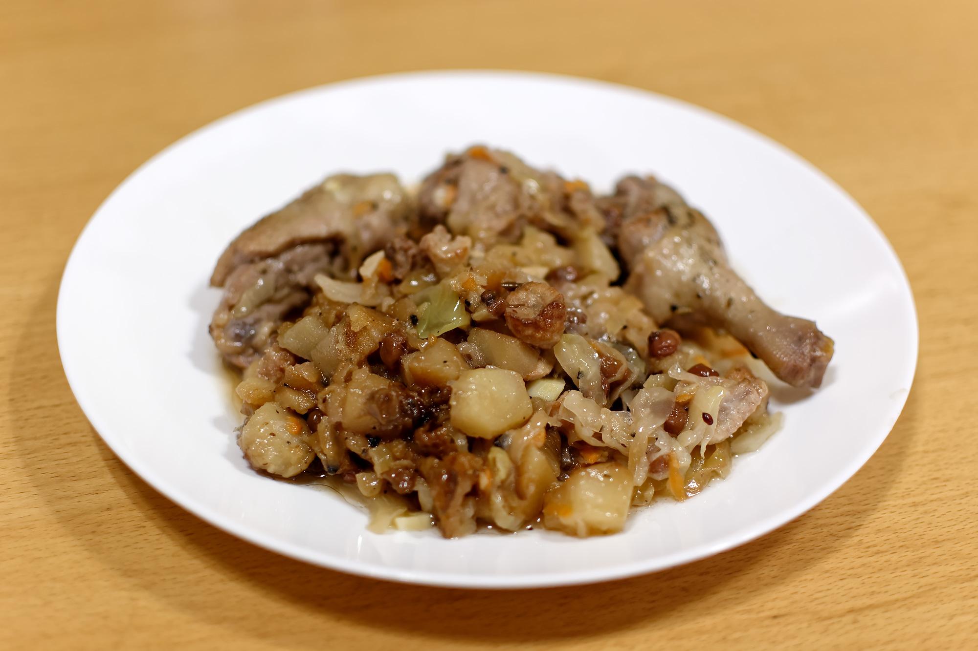 Мультиварку затем поставили в режим тушения на 2 часа. За несколько минут до готовности добавили мелко нарезанный чеснок.