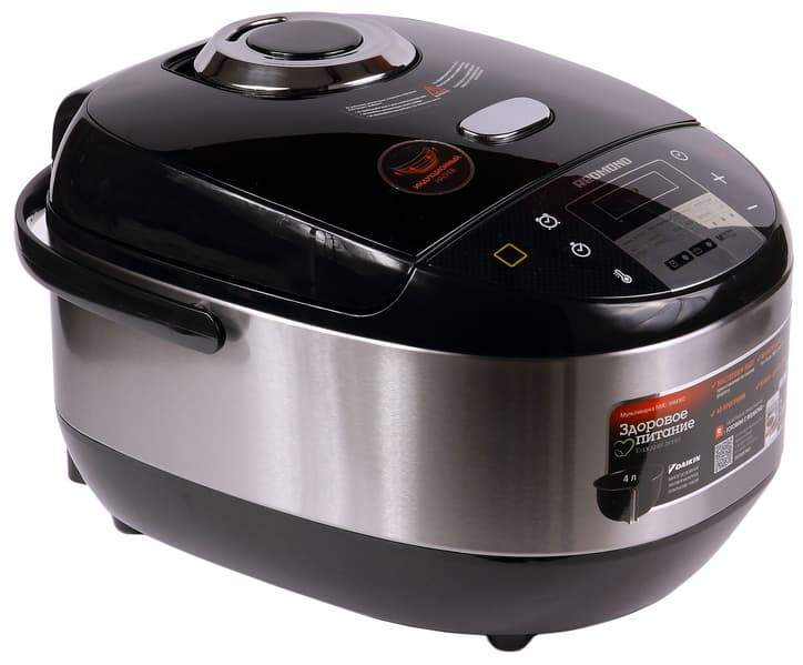 Управляется мультиварка с помощью панели с сенсорными кнопками и красными светодиодными индикаторами. Для переноски мультиварки имеется откидная ручка.