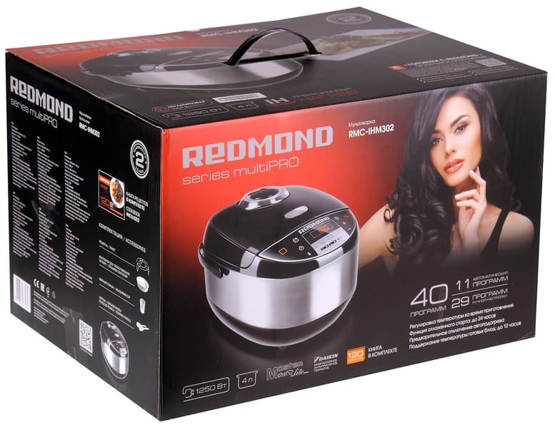 Для оформления коробки использована стандартная «редмондовская» красно-черная цветовая гамма и стандартные же приемы — фотография симпатичной девушки, изображение мультиварки, фотография готового блюда из рыбы, а также полезная информация, касающаяся технических характеристик прибора и его ключевых особенностей.