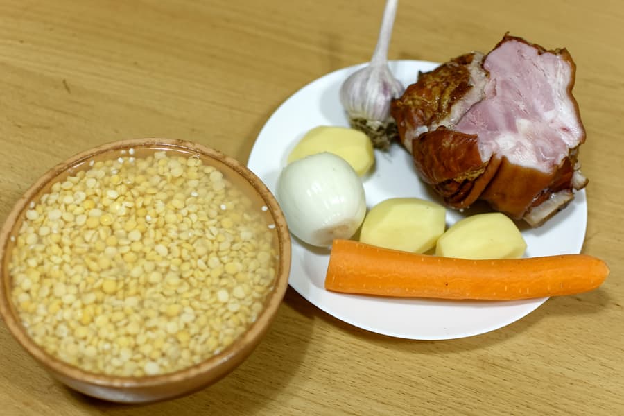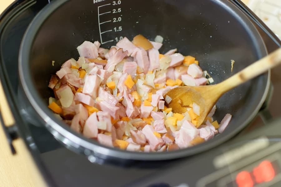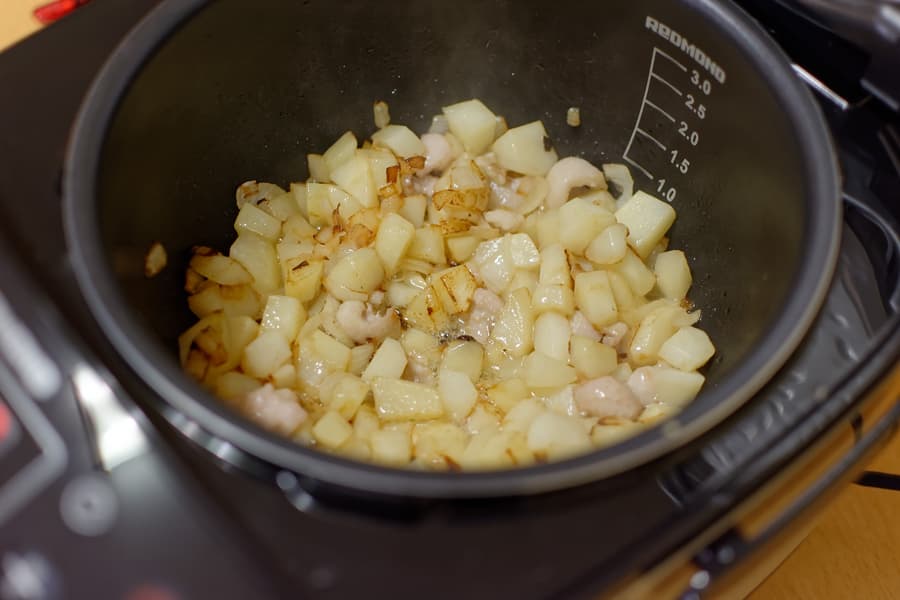 Снова зажарка на индукции — очень приятное начало теста. Обжариваем на соответствующем режиме лук, морковку, затем нарезанную мякоть рульки, закладываем картошку и заранее замоченный горох, добавляем соли и специй и заливаем водой по отметку 3.0.