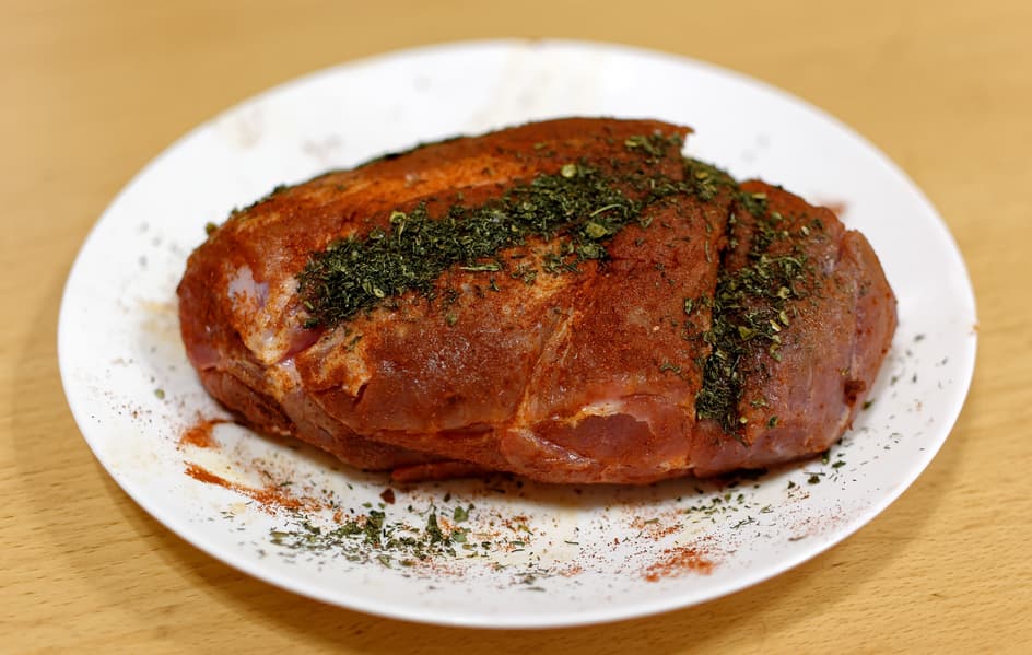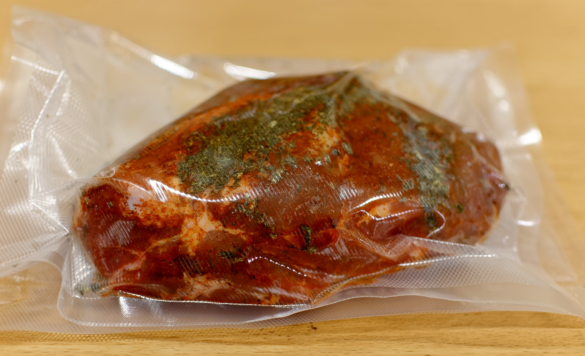 Мы натерли свинину солью и паприкой, добавили «зеленой приправы» из сушеных трав и зеленого чили. Вакуумировали кусок.