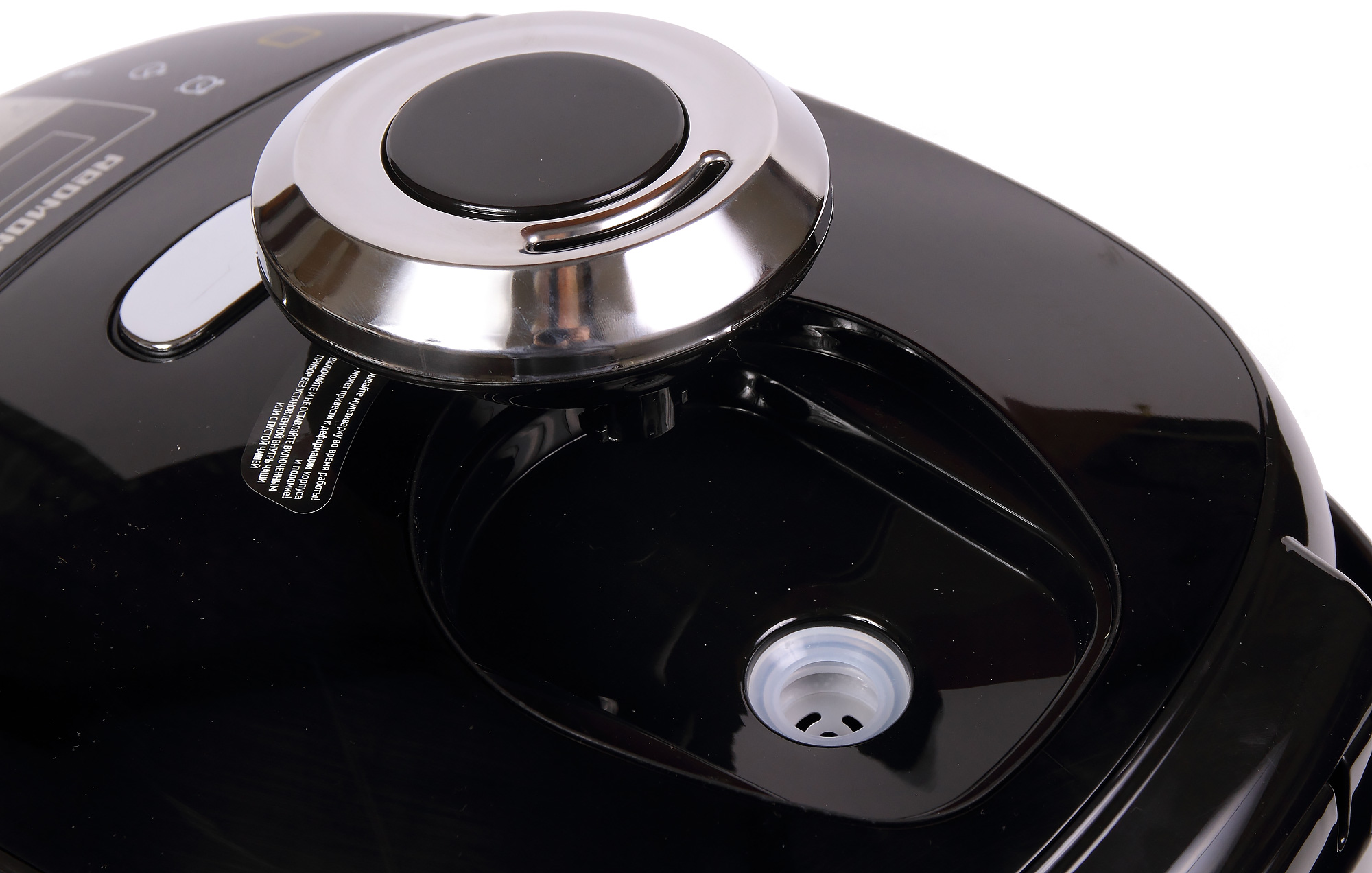 Сверху находится пластиковая крышка, открывающаяся при помощи нажатия на механическую кнопку. С внешней стороны крышки расположен съемный разборный клапан выпуска пара. С внутренней — съемная внутренняя крышка.