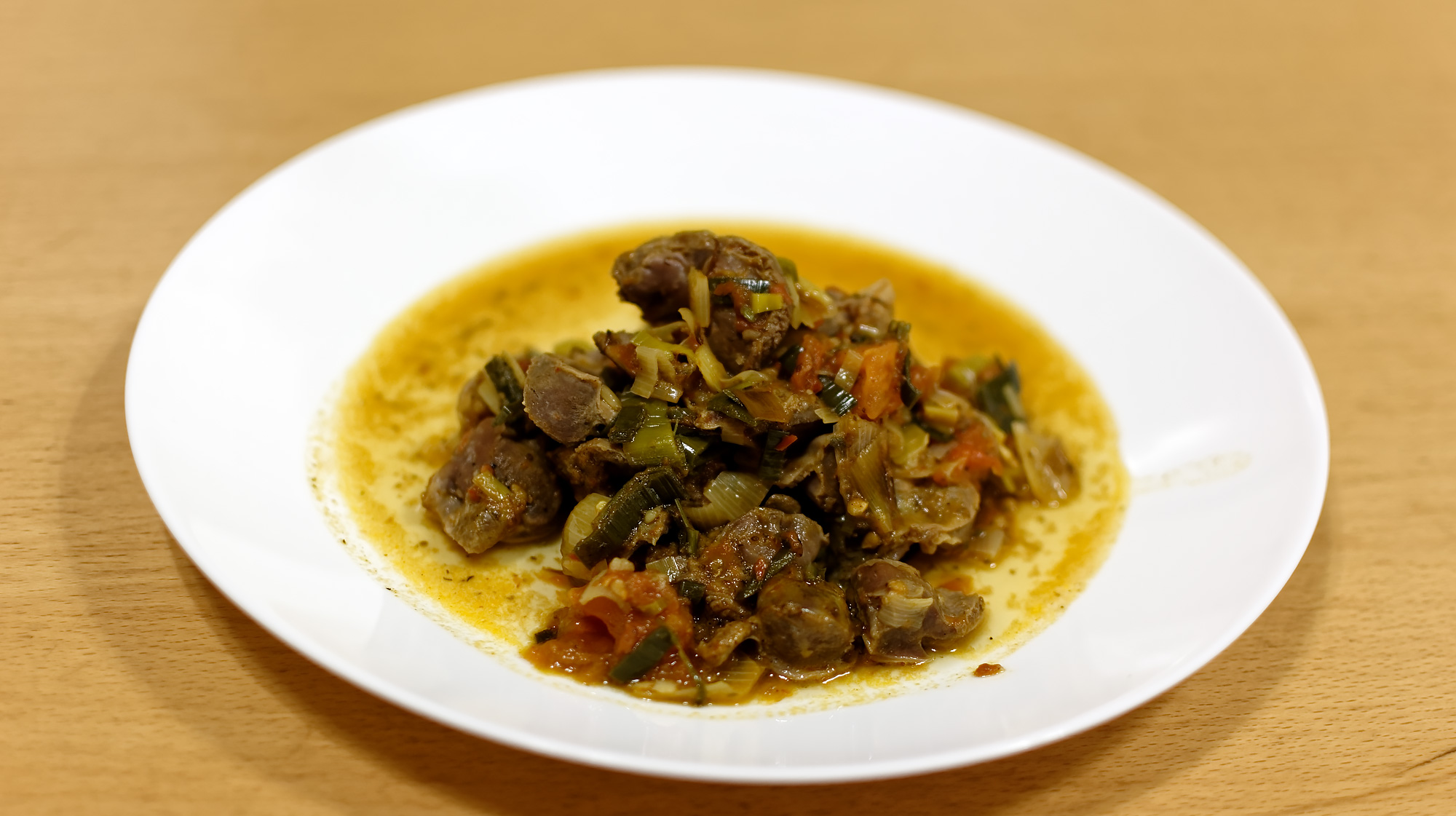 Для приготовления этого блюда нужно подготовить желудки (удалить пленки). На гусином жиру (можно заменить смальцем или топленым маслом), обжарить белую часть порея, затем добавить обесшкуренные и нарезанные помидоры, желудки и специи, посолить. Мы добавили еще и нарезанную мелкой соломкой зеленую часть порея.