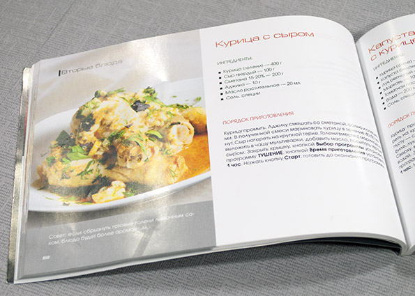 Такие кулинарные пособия у фирмы Redmond ранжируются в зависимости от того, какую модель мультиварки вы приобретаете: совсем простые варианты прибора обладают парой-тройкой основных функций, рецептов им тоже, соответственно, полагается поменьше. У самых дорогих моделей — самые толстые поваренные книги в комплекте. Мы тестируем, как мы уже говорили, модель из среднего ценового диапазона, умеет она достаточно многое, поэтому и книга нам досталась средней роскошности наполнения. Впрочем, для тех, кому 120 рецептов все же мало — на сайте интернет-магазина представительства Redmond в России собраны все рецепты ко всем моделям. Только не забудьте проверить, есть ли у вас нужные режимы.