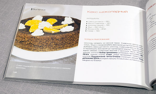 Не у всех мультиварок есть функция выпечки. У нашей модели есть, и это несомненный повод к тестированию. Выбирали, что именно готовить, по впечатлениям от картинок в книге. Шоколадный кекс вышел на фотографии лучше всего — его и готовили. Время подготовки теста к закладке в чашу — 15 минут. Но это при условии, что у вас есть миксер, вы уже готовили кондитерские изделия и у вас есть представление о том, как оптимизировать процесс. Например, проще растопить шоколад на водяной бане, а не тереть его на терке. Все, что умеет плавиться, занимается этим, не требуя особого внимания, пока вы взбиваете остальные ингредиенты в миксере.