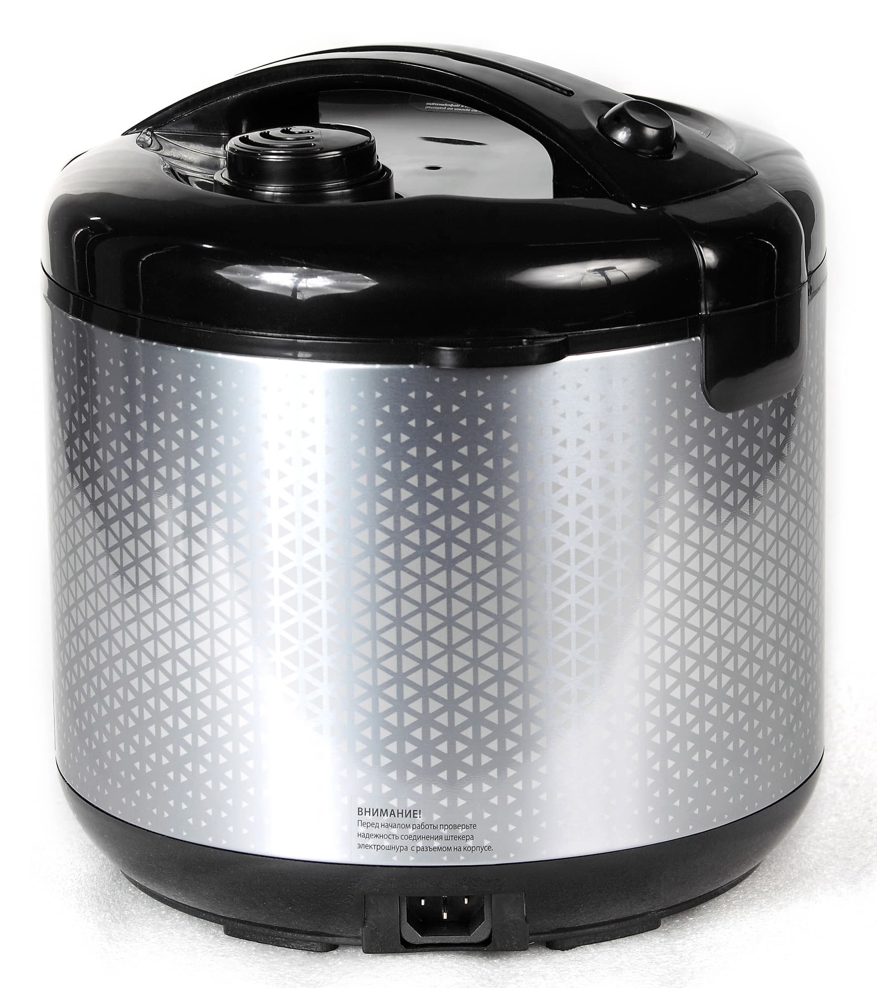 Визуально мультиварка производит впечатление относительно недорогого, но качественно собранного устройства. Корпус прибора выполнен из согнутого листа нержавеющей стали, на крышке помимо ручки расположена кнопка фиксации и съемный клапан выпуска пара. Снизу можно увидеть пластиковые ножки. Сзади — разъем для крепления провода питания. Сбоку — контейнер для сбора конденсата.