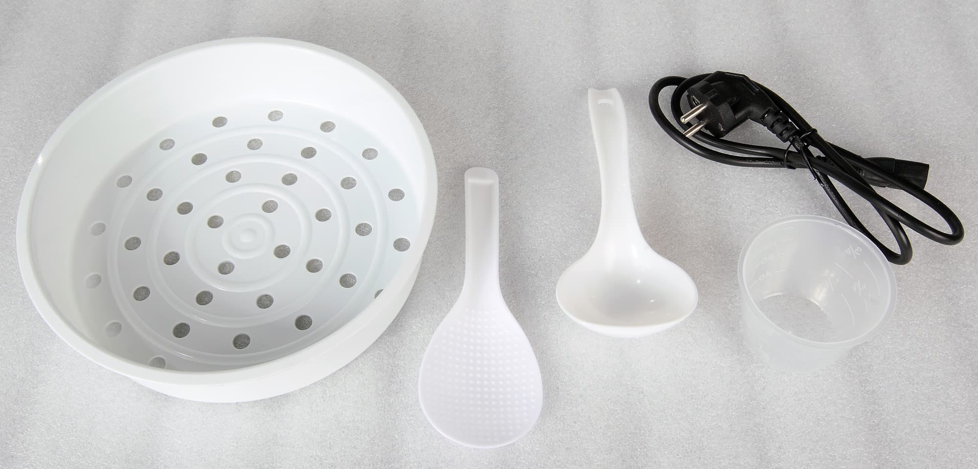 Дополнительные аксессуары (контейнер для приготовления на пару́, пластиковые ложка и черпак, мерный стакан) также стандартны для большинства мультиварок: они нам уже неоднократно встречались в других моделях мультиварок от Redmond.
