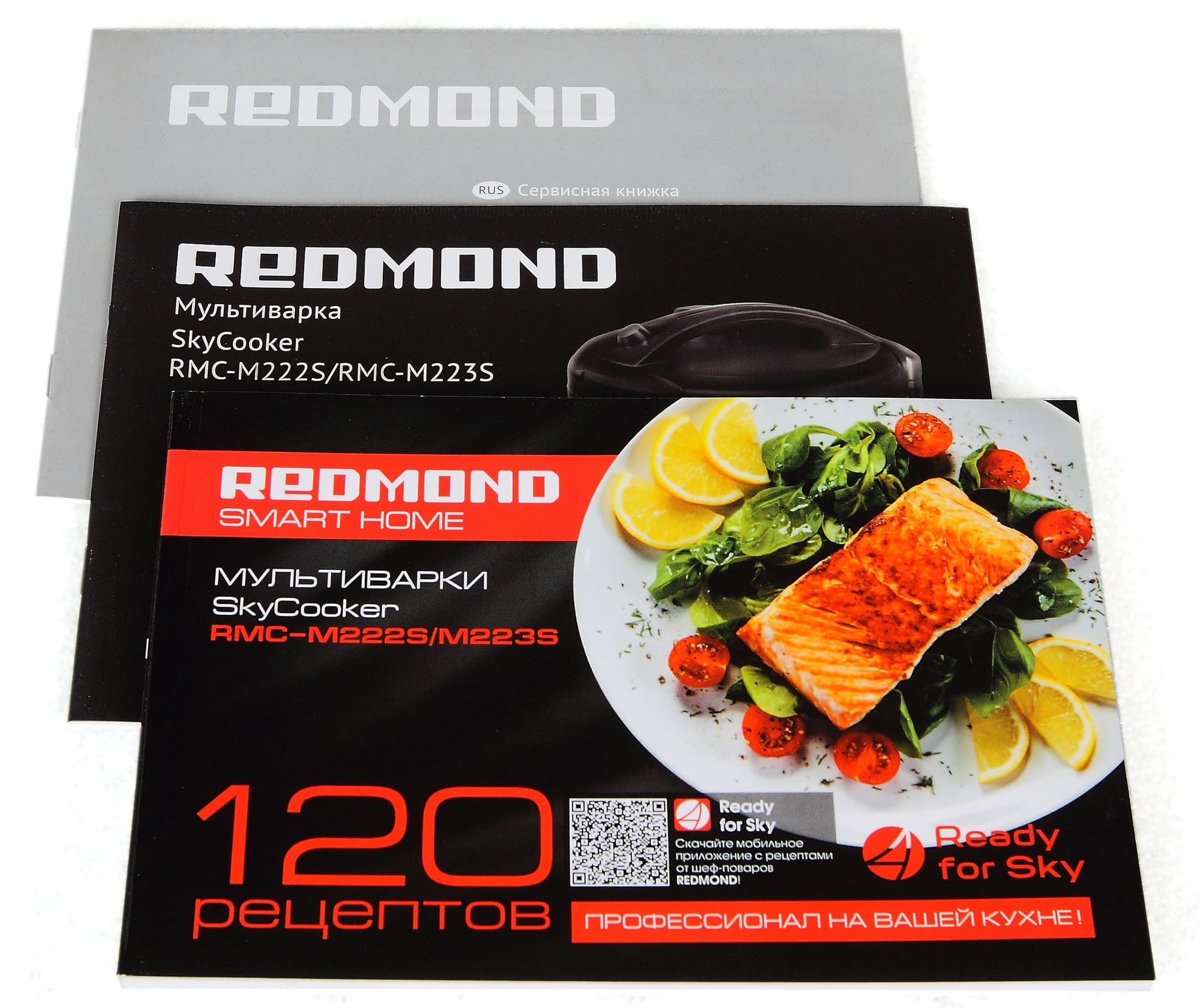 В комплекте к прибору также прилагается книга, содержащая 120 рецептов на все случаи жизни. Каждый рецепт снабжен инструкцией по приготовлению и полезным советом, а также цветной фотографией. Выглядит книга рецептов отлично и может разнообразить домашнее меню на несколько месяцев, но только для тех, кто раньше не сталкивался с продукцией Redmond. Те, кто уже имел опыт использования мультиварки от Rеdmond, в основном обнаружат хорошо знакомые рецепты (иногда, впрочем, проиллюстрированные новыми фотографиями).