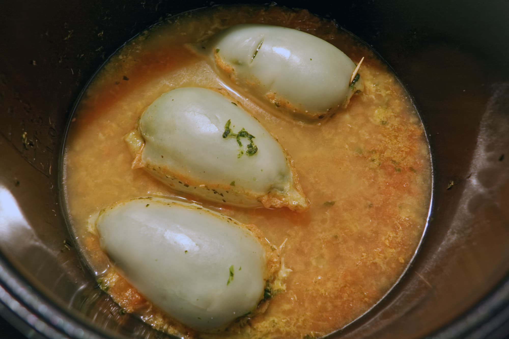 После этого в чашу мультиварки выкладываются оставшиеся помидоры (300 г), добавляется вода, а сверху выкладываются кальмары. Содержимое чаши готовится на программе «тушение» 25 минут.