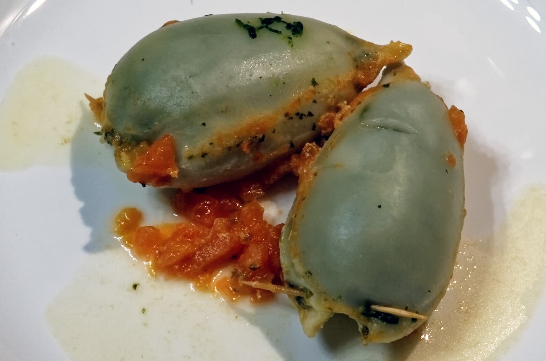 На первой стадии часть помидоров, шпинат и орешки обжариваются на программе «Жарка» в течении 7 минут. Затем в чашу мультиварки добавляются сыр, соль и специи, и содержимое тщательно перемешивается. Тушки кальмаров фаршируются готовой смесью (края скрепляются шпажками).
