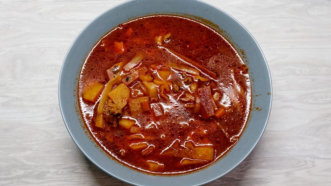 По завершении обжарки выкладываем в чашу мультиварки остальные ингредиенты, добавляем соль и специи, заливаем водой, перемешиваем и готовим на программе «суп» 1 час 20 минут.