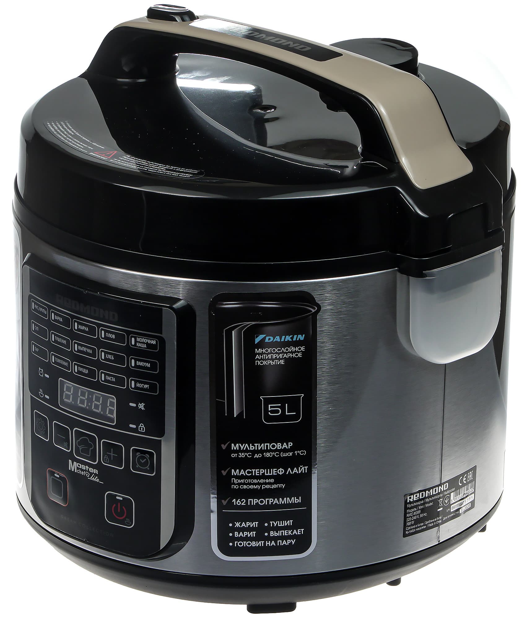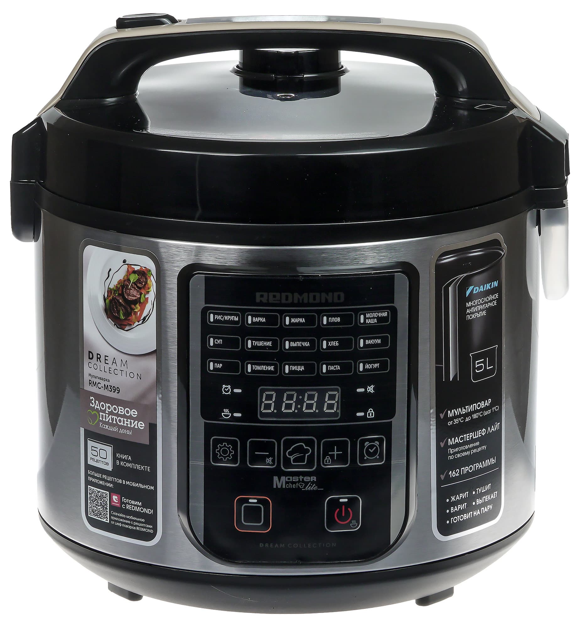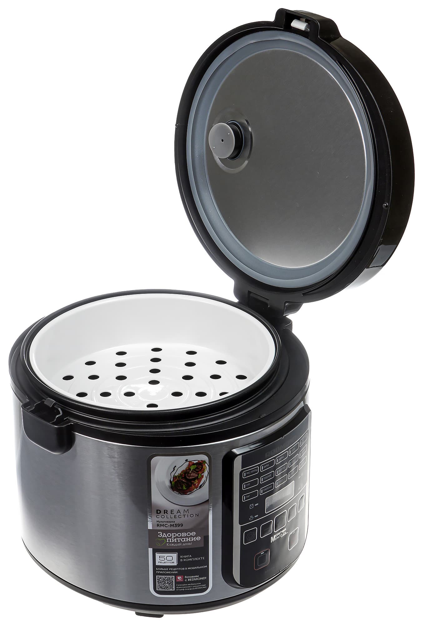 Мультиварка Redmond RMC-M399 — довольно обычное, можно сказать классическое устройство. Прибор обладает вполне стандартными техническими характеристиками и предназначен для выполнения стандартных же задач. В нашем распоряжении окажется набор встроенных программ, возможность изменения режима приготовления «на лету», а также режим «Мультиповар», позволяющий устанавливать произвольную температуру и время приготовления.