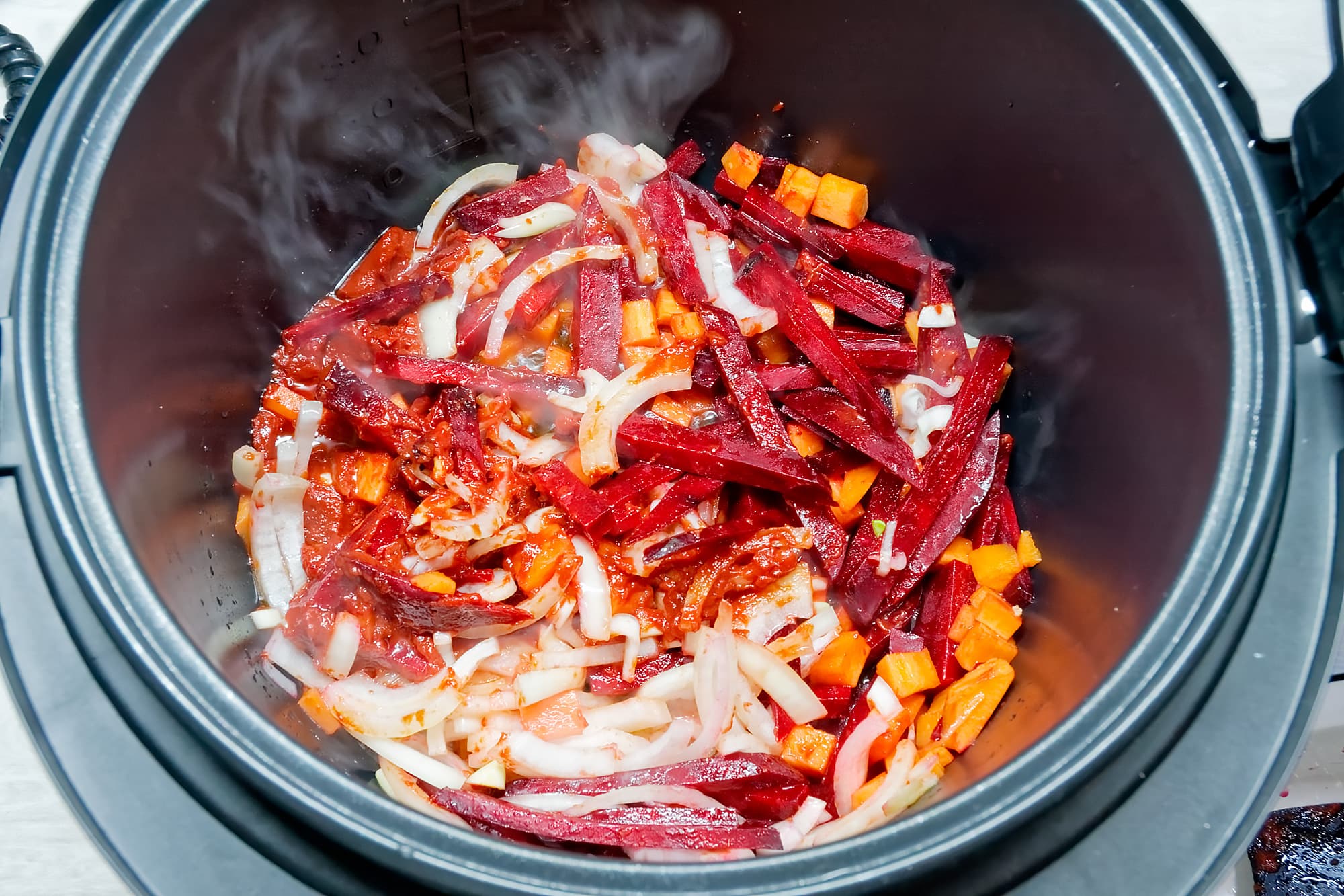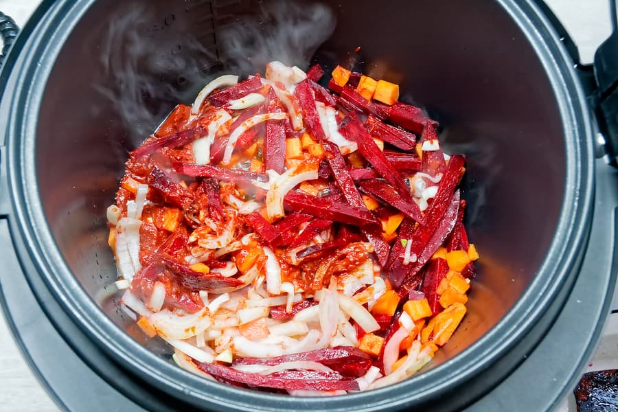 В чашу мультиварки наливаем растительное масло, выбираем программу «жарка» и в течение 15 минут обжариваем лук, морковь, свеклу и томатную пасту, периодически помешивая.
