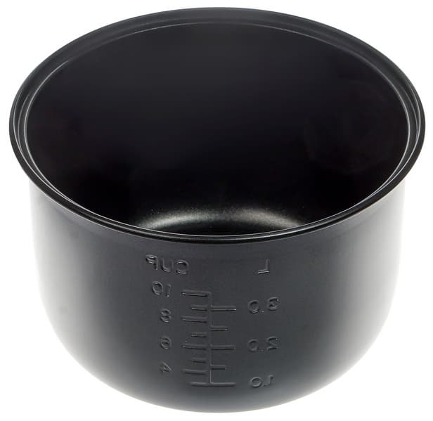 Внутрь прибора вставляется чаша с антипригарным покрытием. На внутренней стороне она имеет шкалу (градуировку) от 1 до 3,5 литров с шагом в 0,5 литра, а также от 3 до 10 чашек. Максимально допустимый объем приготавливаемых продуктов — 3,5-4 литра.