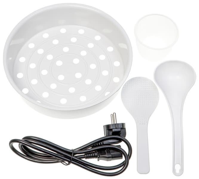 В комплекте с мультиваркой обнаружился стандартный набор аксессуаров — пластиковый мерный стакан, пластиковые ложка и черпак, пластиковый контейнер для приготовления на пару́. Не хватает, разве что, силиконовой лопатки, которой мы настоятельно рекомендуем пользоваться чтобы не повредить антипригарное покрытие.