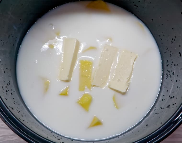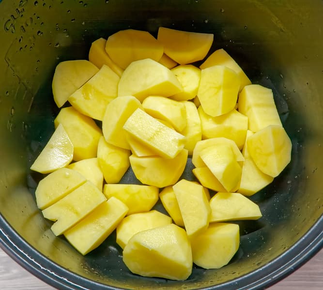 Очищенный картофель разрезаем на шесть частей, выкладываем в чашу мультиварки, заливаем молоком и водой, добавляем сливочное масло и соль.