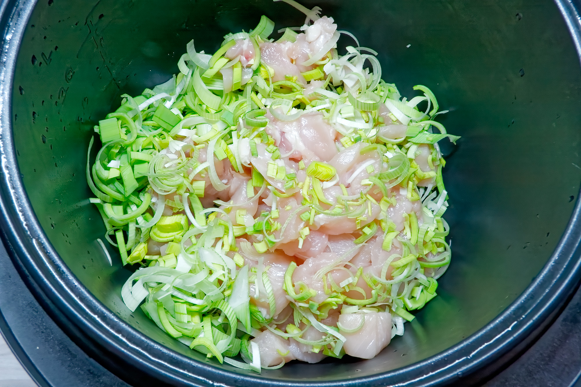 Курицу нарезаем кубиками по 1,5-2 сантиметра, лук-порей — мелкой соломкой.