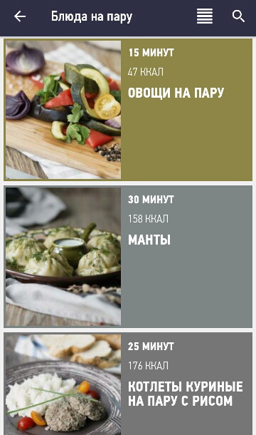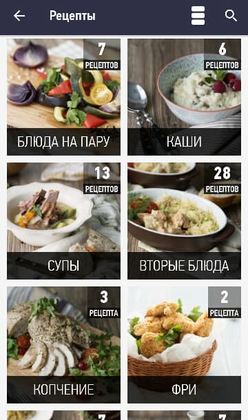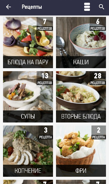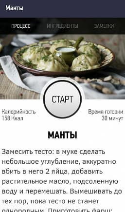 В пункте главного меню «Рецепты» все блюда представлены по категориям, поэтому сначала нужно выбрать, что именно хочется приготовить, перейти в соответствующих раздел, а потом уже просматривать предлагаемые варианты. В каждом рецепте есть три вкладки: процесс, ингредиенты, заметки. Запустить процесс приготовления можно прямо из рецепта.