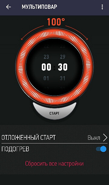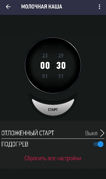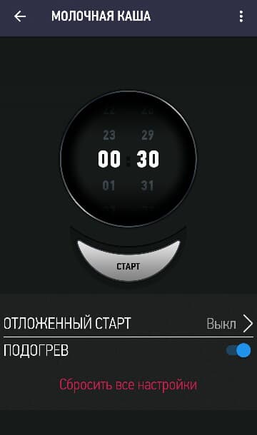 Наконец, рассмотрим последний пункт главного меню — автоматические программы. При нажатии на соответствующую кнопку пользователь видит на экране телефона список программ. Кликнув на программу, переходим к установке продолжительности процесса приготовления и дополнительных функций — отложенному старту и подогреву.