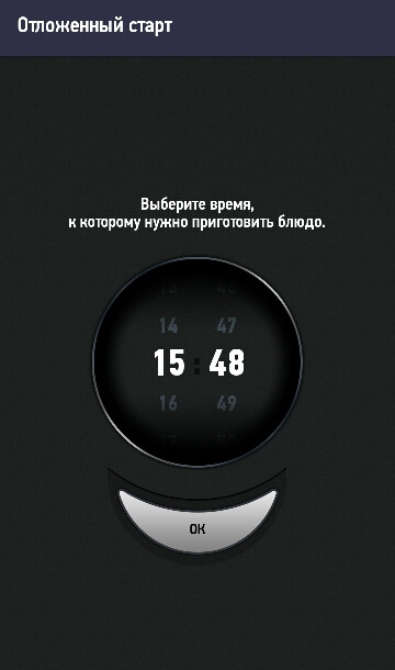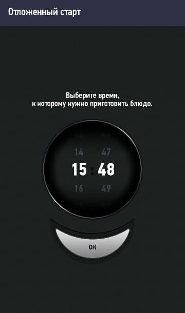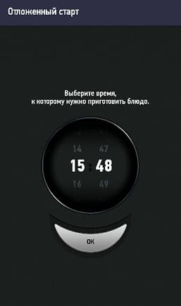 Кстати, отсрочка старта реализована крайне удобно для пользователя. Не нужно высчитывать длительность программы, через сколько часов нужно получить готовое блюдо и производить прочие арифметические действия. Нужно всего лишь задать время, к которому блюдо должно быть готово и нажать кнопку ОК.