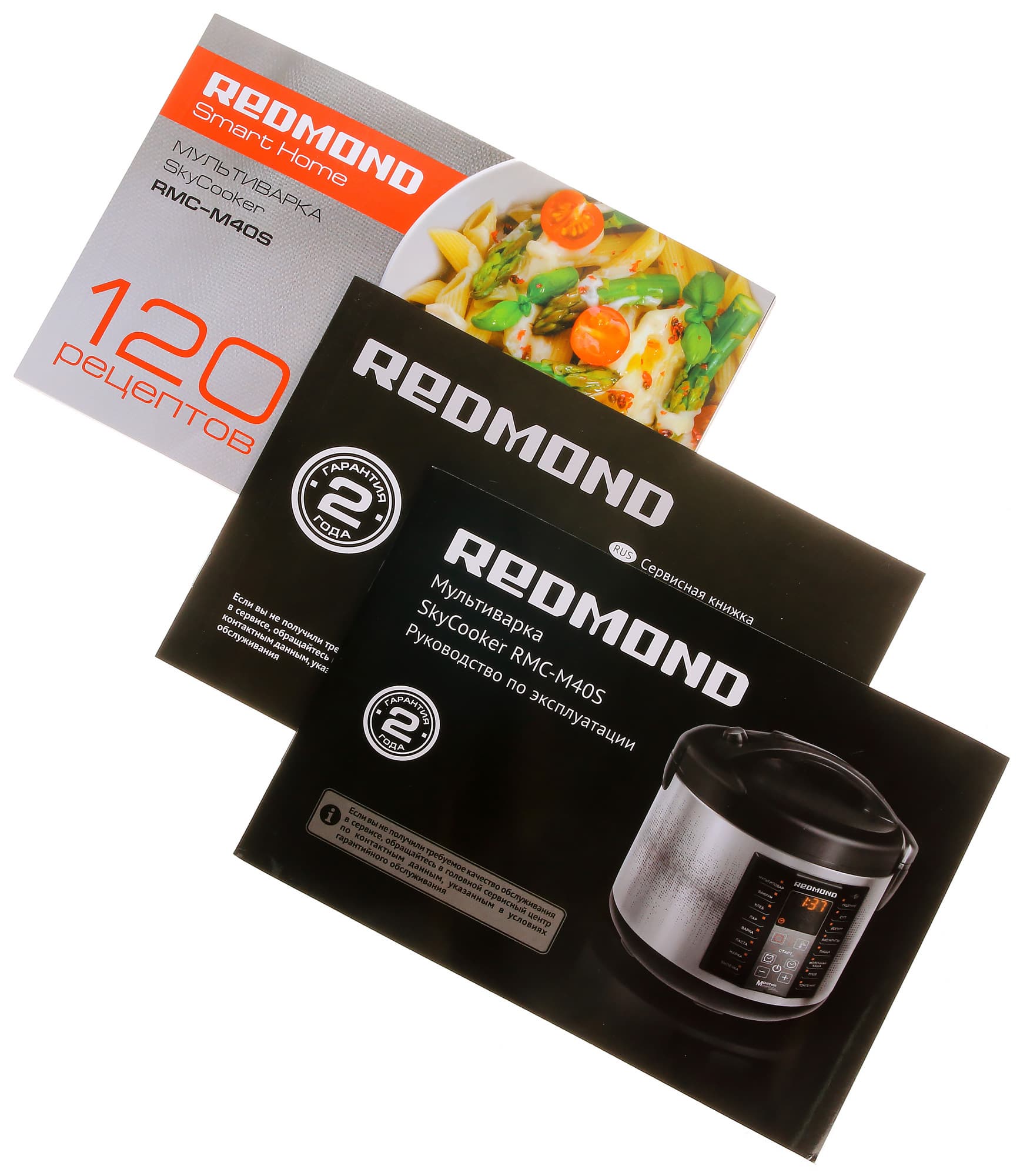 Дополнительные аксессуары (контейнер для приготовления на пару́, ложка и черпак, мерный стакан) стандартны для большинства мультиварок Redmond.