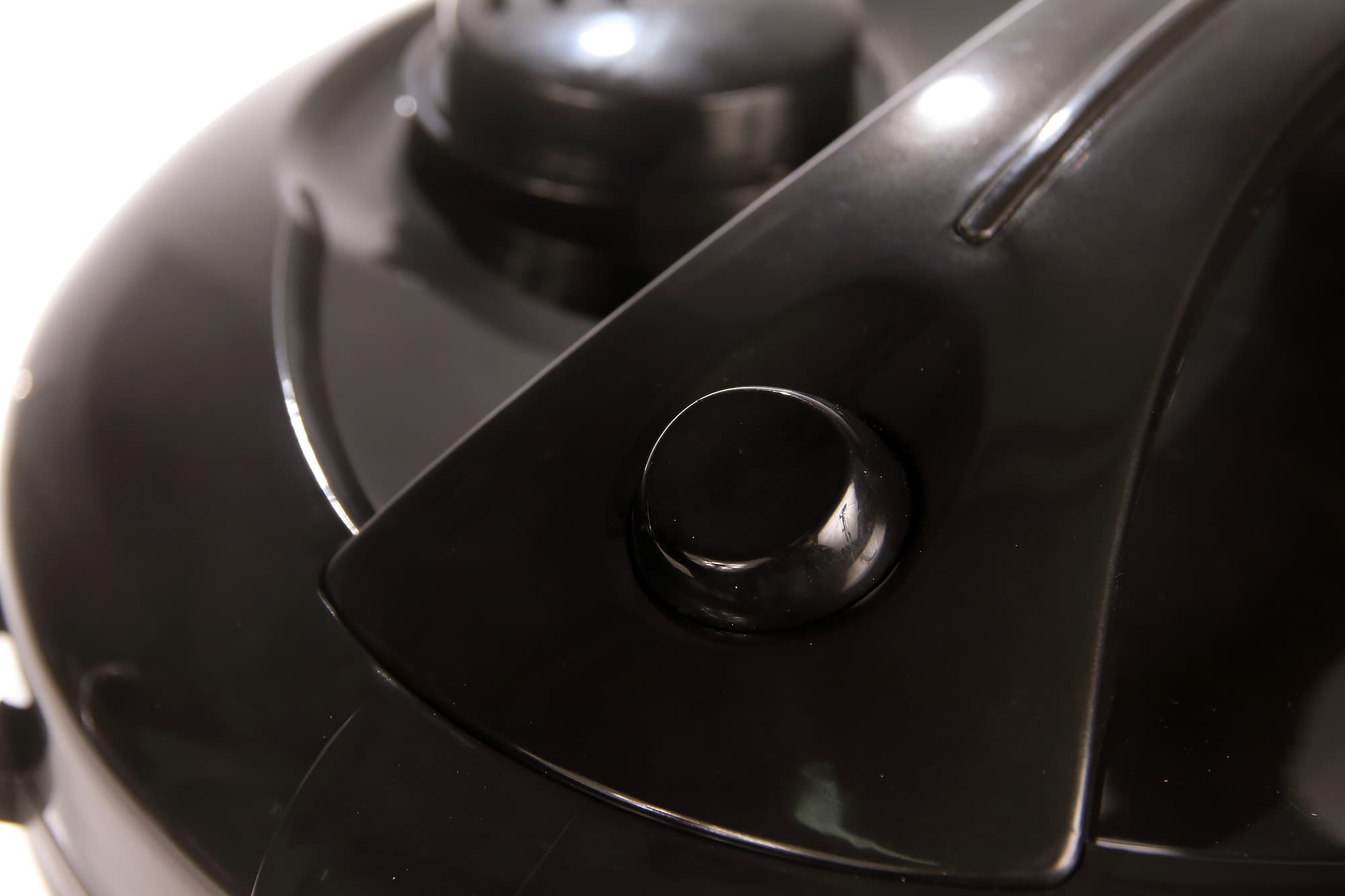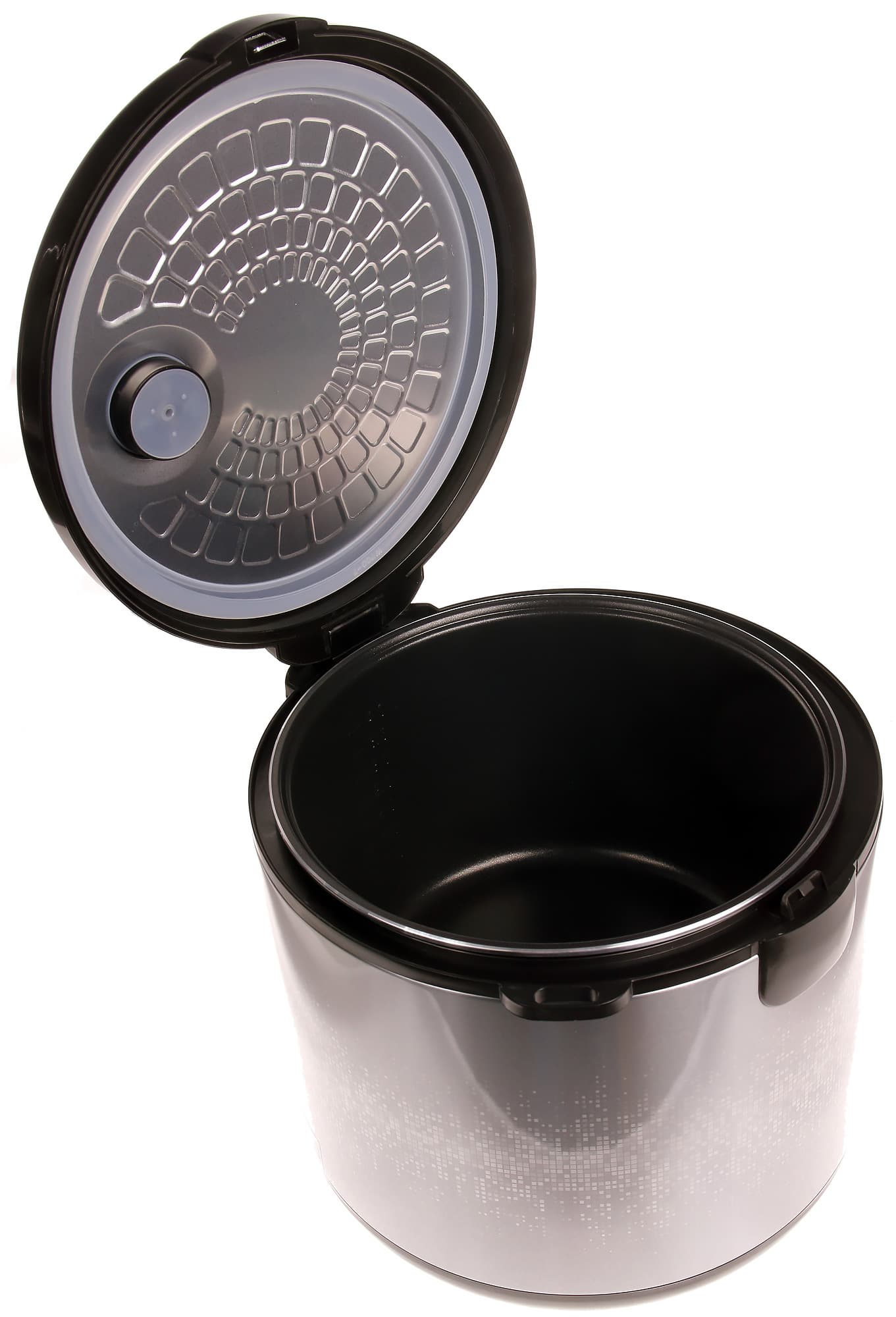 С левой стороны ручки расположена кнопка открытия крышки. При нажатии на нее крышка разблокируется. Крышка несъемная, откидывается вправо. В дальней от пользователя стороне находится съемный паровой клапан. Под местом крепления крышки к корпусу размещается контейнер для сбора конденсата. Также рядом с крышкой имеется держатель черпака или ложки.