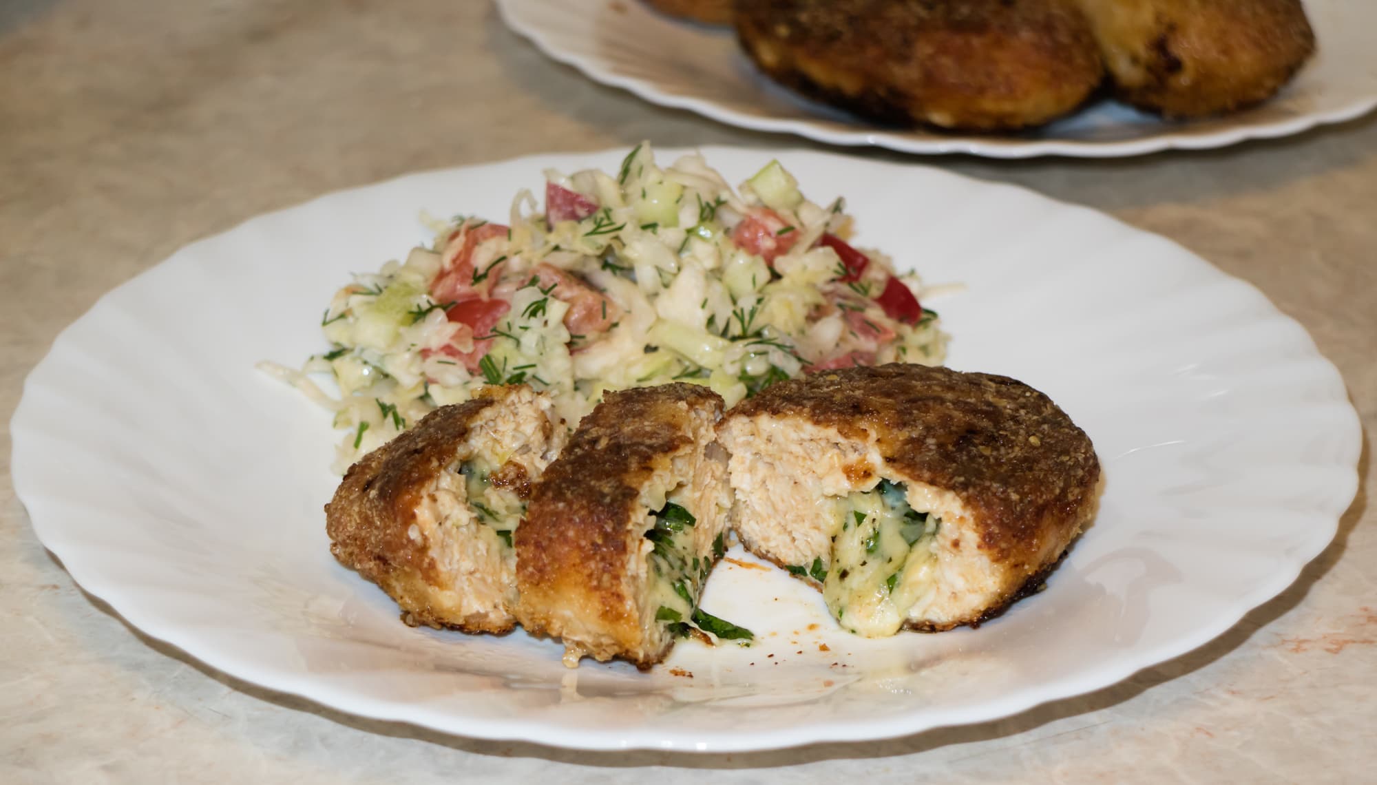 Филе промыли, нарезали на куски. Курицу, лук и чеснок прокрутили через мясорубку, добавили соль, специи и тщательно вымесили. Сформировали котлетки.