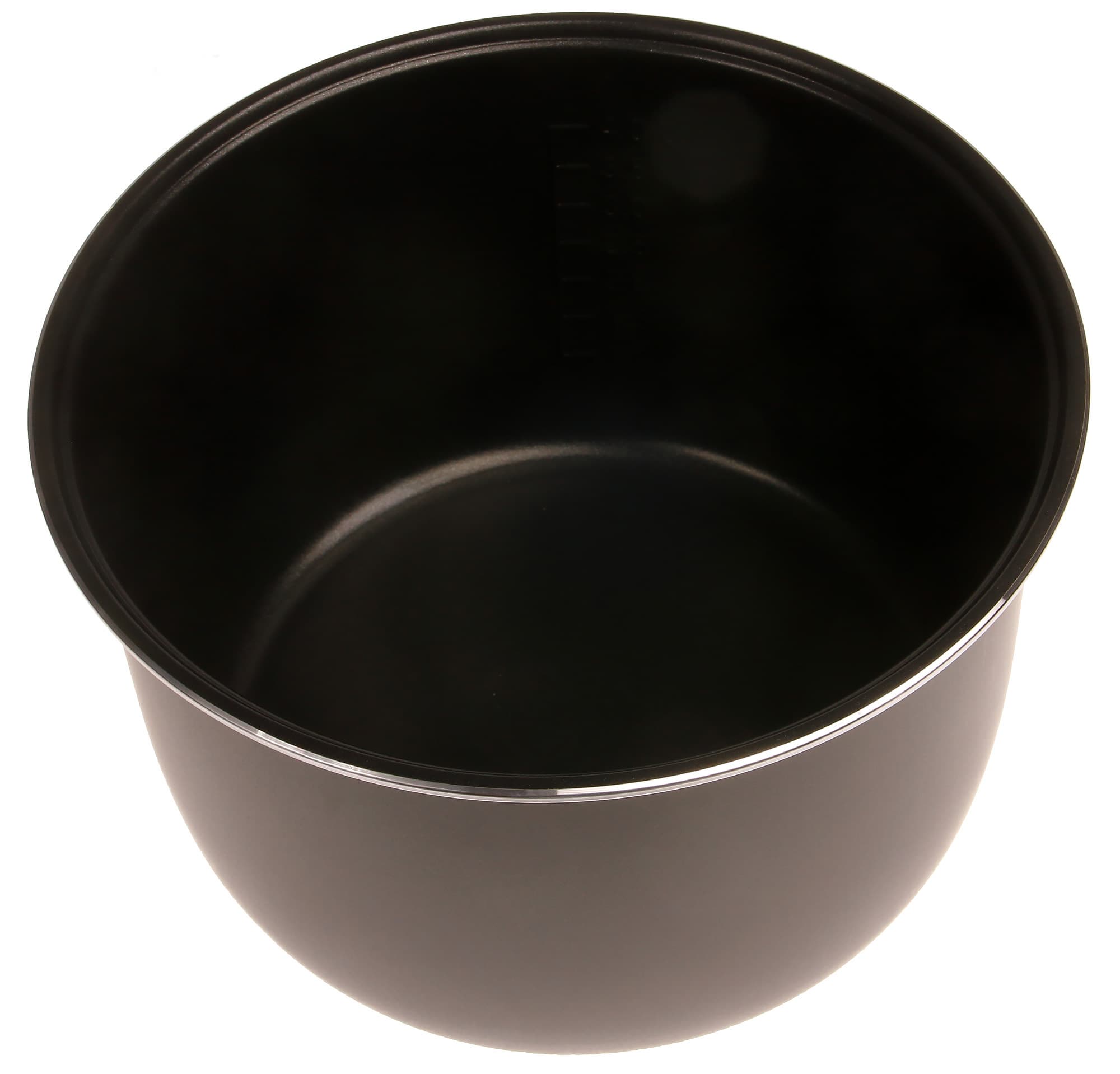 Согласно документации, объем чаши составляет 5 литров. На внутренней стенке чаши нанесена градуировка от 1 до 4 литров с шагом в 0,5 литра. Таким образом, полезный объем чаши оказывается равным 4 литрам. Чаша изготовлена из алюминиевого сплава, изнутри покрыта антипригарным покрытием Daikin. Покрытие не керамическое, относится к разряду тефлоновых.
