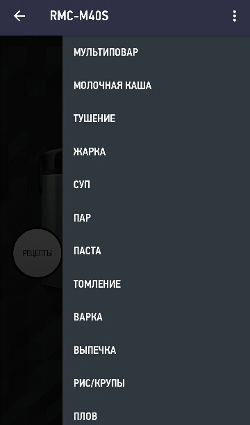 После запуска приложения необходимо создать аккаунт или войти в существующий. Затем нужно подключить мультиварку к электричеству, нажать и удерживать в течение 5 секунд кнопку «+». Во время соединения на дисплее будут отображаться движущиеся квадратики. После установки соединения прибор подаст звуковой сигнал и перейдет в режим ожидания. В приложении в списке подключенных устройств появится мультиварка RMC-M40S, при нажатии на устройство на экран телефона выводится следующее меню: