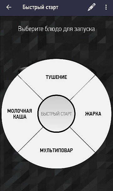Из главного меню пользователь может перейти к разделу рецептов, выбору автоматических программ или быстро запустить работу. При выборе последнего варианта появляется выбор между тремя блюдами и программой «Мультиповар». Если нажать на «Мультиповар», то можно самостоятельно задать температуру и время приготовления, а также активировать функцию отложенного старта или автоподогрева.