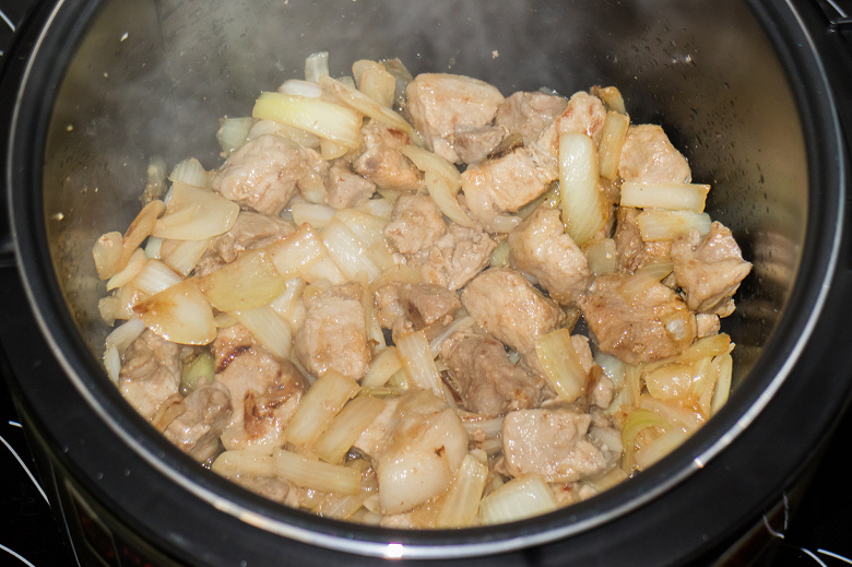 Свинину промыли и нарезали на равные кусочки. Овощи также подготовили: помыли, очистили и нарезали. Затем включили программу «Жарка». Продолжительность по умолчанию 18 минут. После сигнала о нагреве выложили в чашу свинину. Крышку оставили открытой. Через 10 минут мясо слегка подрумянилось, добавили лук. Периодически помешивали. Жарили до окончания программы. Не сказать, что лук хорошо поджарился, но и тушеным его назвать нельзя.