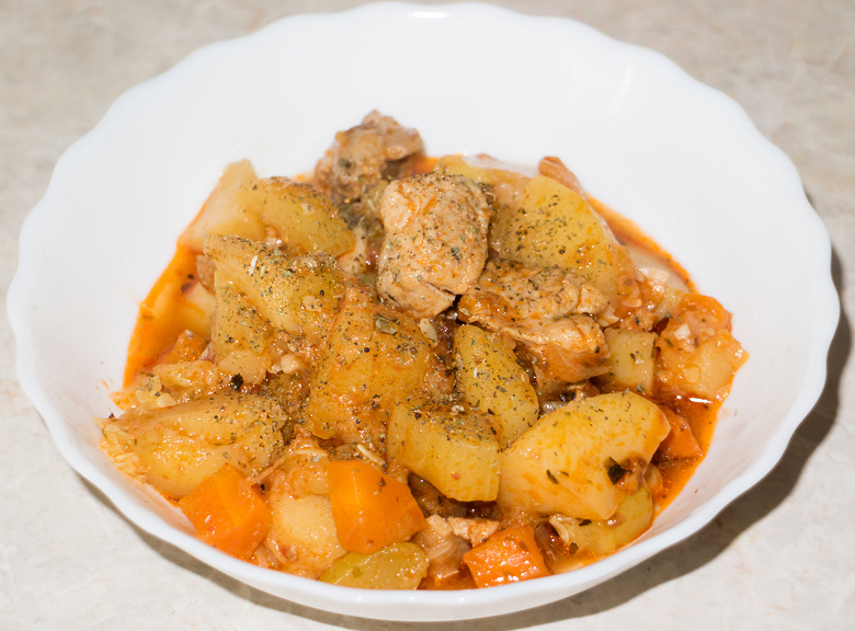 Выложили все овощи, посолили, добавили специй, паприки, зелени, сухого чеснока. Включили программу «Тушение» на 45 минут. По завершении получили отличное сытное и ароматное блюдо.