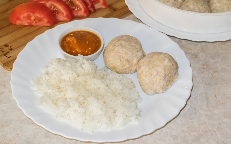 По окончании цикла сняли контейнер для варки с котлетами. Рис оказался полностью готов. Каша рассыпчатая, не вязкая. А вот котлеты внутри оказались чуть сыроваты. Значит, наши котлеты оказались великоваты и в следующий раз нужно формировать их меньшего размера. Мы же, чтобы довести блюдо до готовности, поставили котлеты на пару минут в микроволновую печь. Подавали с пряным овощным соусом на основе томата.