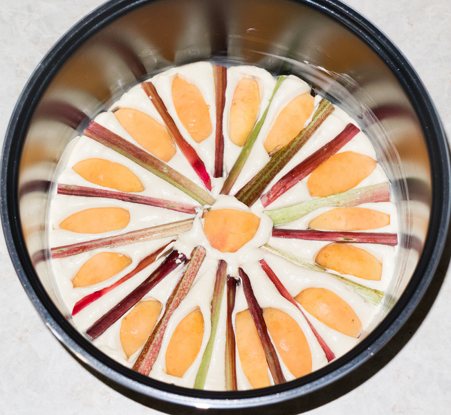 Очень простой, буквально «детский» рецепт. Сахар смешали и взбили с размягченным маслом и солью. Затем по одному добавили яйца, каждый раз тщательно взбивая — по минуте на каждое яйцо. Влили чайную ложку ванильного экстракта, еще раз взбили. В отдельной миске смешали и просеяли муку, крахмал и разрыхлитель. Ввели мучную смесь в масляную. Чашу мультиварки смазали сливочным маслом и выложили тесто. Сверху аккуратно уложили ревень, нарезанный на длинные брусочки, слегка утопили его в тесте.