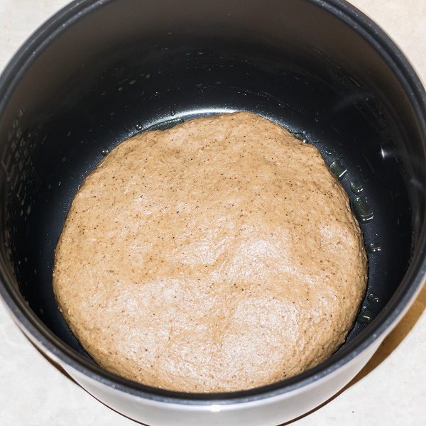 Для приготовления этого хлеба мы использовали готовую хлебную смесь. Добавили к ней воду, дрожжи, растительное масло и замесили тесто. Смазали дно и стенки мультиварки растительным маслом, выложили и разровняли тесто. Задали программу «Хлеб», время по умолчанию — 3 часа.