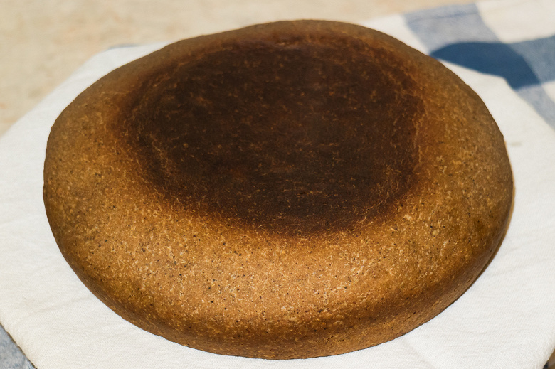 Час продолжался этап расстойки. Затем началась выпечка. Два часа выпечки нам показались слегка чрезмерным временем тепловой обработки буханки хлеба, но мы, взяв волю в кулак, решили все же довериться установкам автоматической программы. Через два часа после начала процесса раздался звуковой сигнал, извещающий нас о том, что хлеб нужно перевернуть. Накрыв чашу тарелкой, мы скинули хлеб, затем, обернув руки полотенцем, перевернули его и поместили назад в чашу. Поскольку обжаренный на первом этапе низ хлеба показался нам чрезмерно темным, мы решили не доводить цикл до конца. Остановили программу и вытащили хлеб на 40-й минуте.
