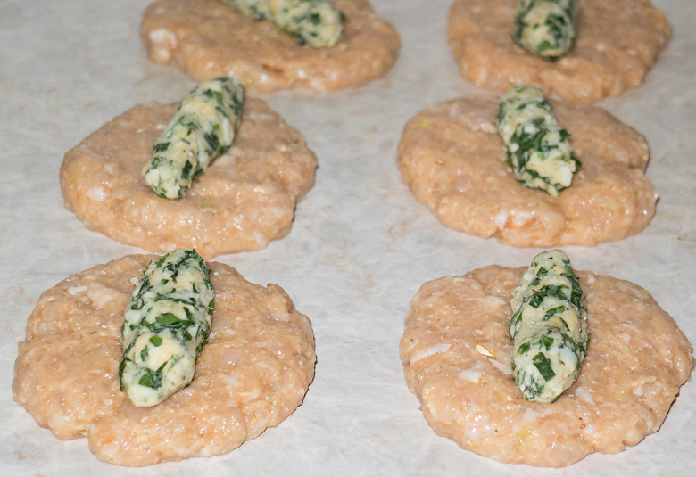 Сыр натерли на крупной терке, зелень мелко нашинковали. Смешали масло, сыр, зелень и соль. Из сырной массы сформовали пять цилиндрических комочков равного диаметра. Убрали в морозилку. Затем занялись фаршем: промыли куриное филе, перемололи в мясорубке, добавили соль, специи и хорошо перемешали до однородной массы. Фарш получился жидковатым, поэтому добавили пару ложек измельченных в кофемолке овсяных хлопьев.