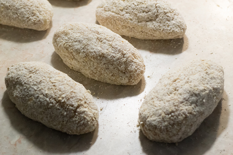 После разделки куриной грудки филе у нас оказалось побольше, чем половина килограмма, поэтому из получившегося фарша сделали семь лепешек. В центр каждой уложили сырный жгутик, сформировали котлеты и обильно обваляли их в молотом геркулесе.