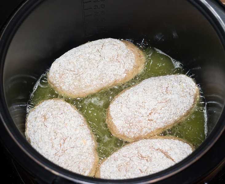 В чашу мультиварки налили масло и включили программу «Жарка», продолжительность уменьшили до 16 минут. После того, как раздался звуковой сигнал, выложили котлеты в масло и закрыли крышку. Через 8 минут открыли крышку, перевернули котлеты и вновь закрыли крышку. Готовили до окончания программы.