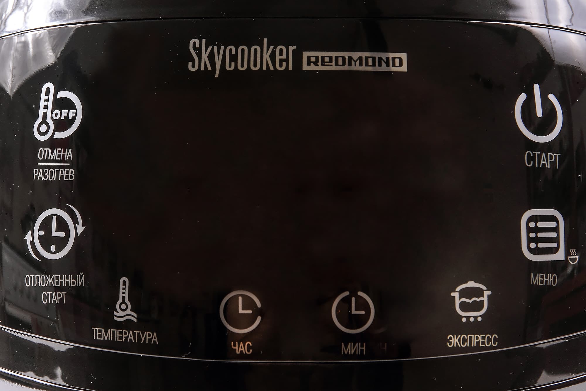 Управление мультиваркой Redmond SkyCooker RMC-M903S осуществляется с помощью панели, расположенной на фронтальной стороне корпуса. Панель состоит из светодиодного дисплея и ряда сенсорных кнопок, расположенных по бокам и снизу от него.