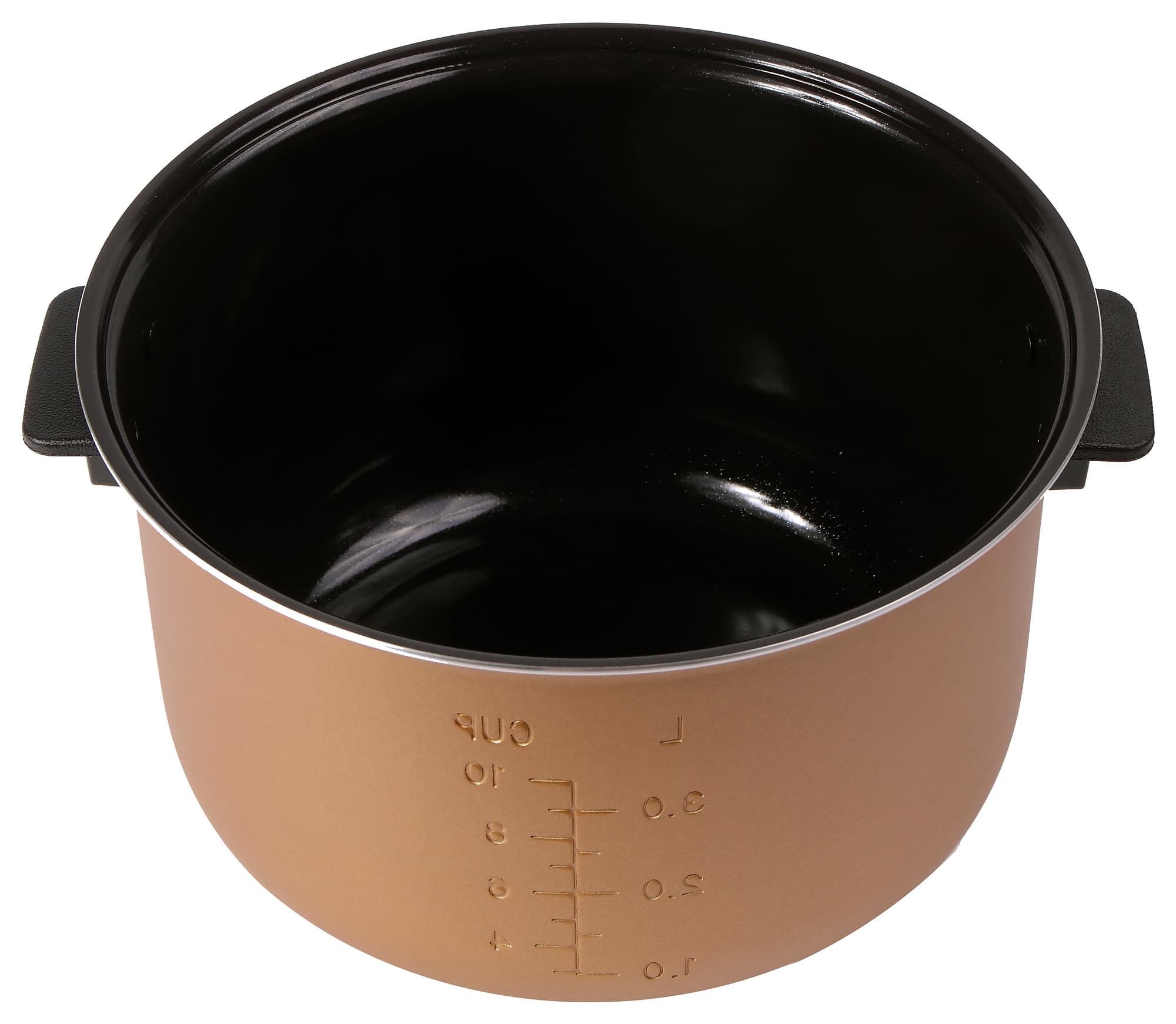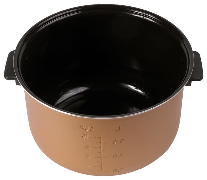 Металлическая чаша окрашена с внешней стороны и покрыта керамическим антипригарным покрытием с внутренней. Покрытие плотное, производит впечатление долговечного. На боковой стороне емкости нанесена градуировка объема от 1 до 3 литров или от 4 до 10 чашек.
