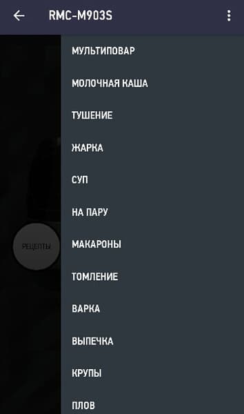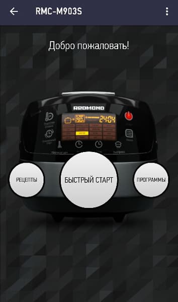 После запуска приложения необходимо создать аккаунт или войти в существующий. Затем нужно подключить мультиварку к электричеству, нажать и удерживать в течение 5 секунд кнопку «Час» на панели управления. Во время соединения на дисплее будут отображаться движущиеся квадратики. После установки соединения прибор подаст звуковой сигнал и перейдет в режим ожидания. В приложении в списке подключенных устройств появится мультиварка RMC-M903S. При выборе устройства на экран телефона выводится главное меню, из которого пользователь может перейти к разделу рецептов, выбору автоматических программ или быстро запустить работу.