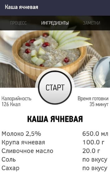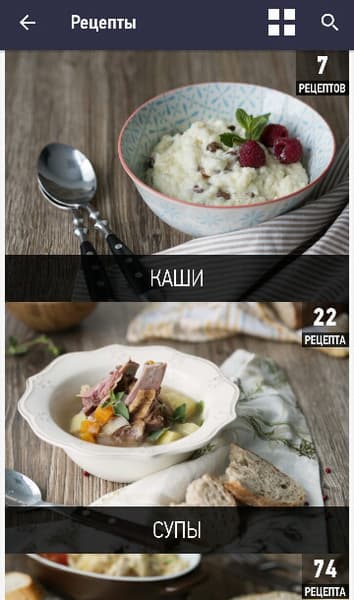 При переходе в пункт меню «Рецепты» пользователь видит список рецептов, сгруппированный по категориям блюд. При переходе в категорию можно просмотреть все имеющиеся в базе рецепты. В каждом рецепте есть три вкладки: процесс, ингредиенты, заметки. Запустить процесс приготовления можно прямо из рецепта, без установки программы, времени и температуры.