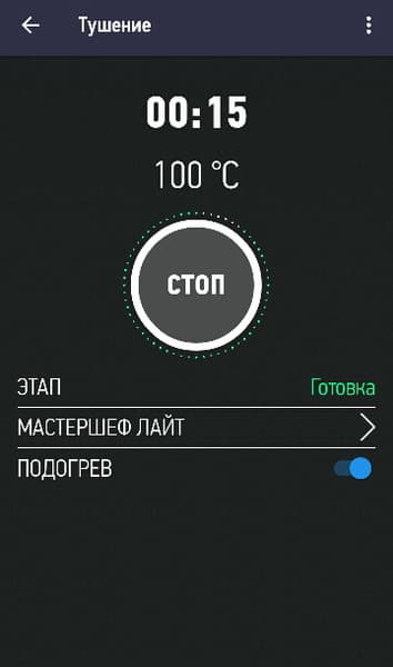 Последняя вкладка главного меню — программы. При нажатии на соответствующую кнопку пользователь видит на экране телефона список всех автоматических программ. Кликнув на программу, переходим к установке продолжительности процесса приготовления и дополнительных функций — отложенному старту и подогреву. Если цикл уже запущен, пользователь имеет возможность изменить его продолжительность или температуру при помощи функции «МастерШеф Лайт»