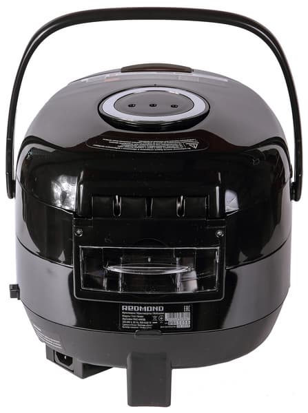 Коробка, в которой поставляется прибор, изготовлена из окрашенного картона. Оформлена в обычном для Redmond, но спокойном, более благородном стиле: черный цвет фона, цвета и размеры шрифтов не вызывают ощущение аляповатости, никаких симпатичных барышень — все конкретно и по делу. Сведения об изделии, его технических характеристиках, возможностях и дополнительная информация представлены на русском языке и дублируются на английском. Коробка оснащена пластиковой ручкой для переноски. Мультиварка и ее аксессуары защищены от ударов и повреждений пенопластовыми вставками и полиэтиленовыми пакетами.