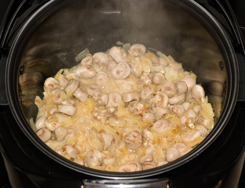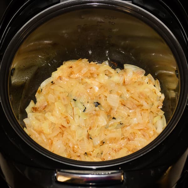 Для начала обжарили в режиме «Жарка» две крупные луковицы. Для того чтобы лук карамелизовался и стал золотисто-коричневым, потребовалось 15 минут.
