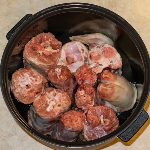 Для приготовления холодца мы взяли два говяжьих хвоста и одну крупную свиную ножку. Напилили мясные продукты так, чтобы они поместились в чашу мультиварки. Залили водой, добавили соль, лавровый лист и черный перец горошком.